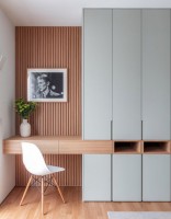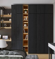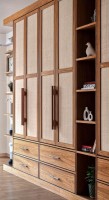 Добавим декоративные материалы: художественные стекла и фрески. Для шпонированных шкафов основой служит МДФ. В последнее время у нас часто заказывают в шпоне американского ореха, оливкового и дальневосточного ясеня и этимое.